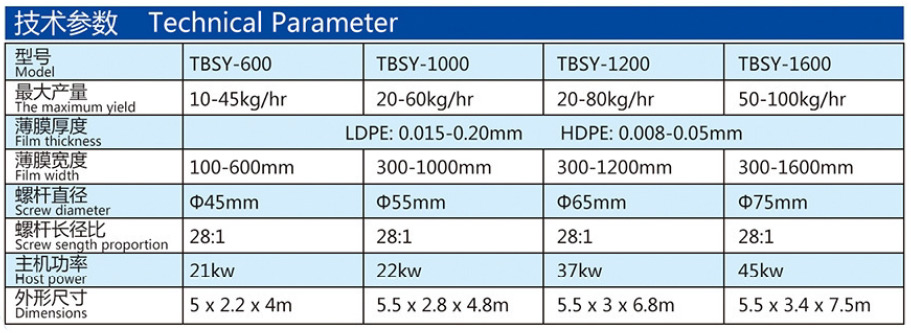 吹制各種規格的低密度聚乙烯、高密度聚乙烯和線性低密度聚乙烯塑料薄膜,廣泛應用于食品百貨、日用、化工、針紡品、購物禮袋和工業包裝。機簡、螺桿采用38CrMoAl合金材料經氮化處理精密加工而成,具有很好的耐磨和耐腐蝕性。